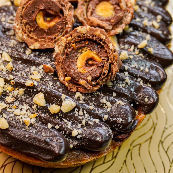 Casca de cookie tradicional com gotas de chocolate nobre ao leite. Recheio em três camadas: brigadeiro meio amargo, Nutella com avelã triturada e flocos crocantes e mais uma camada de brigadeiro. Para completar, pedaços de avelã e bombom Ferrero Rocher.
