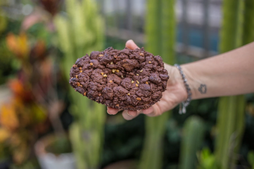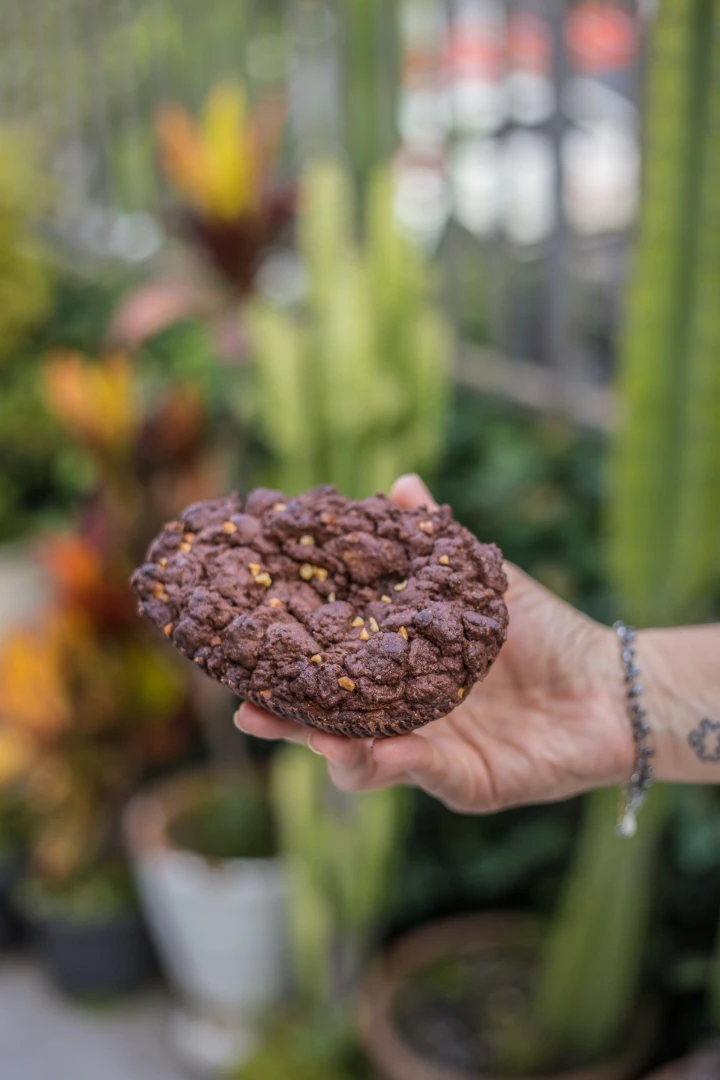 Base de brownie de chocolate meio amargo, recheado com brigadeiro de caramelo cremoso com amendoim e coberto com cookie duplo chocolate.